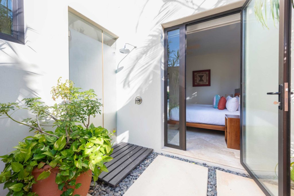 Two-story casita with approximately 3,807 square feet of indoor and outdoor space, 3-bedrooms, each with full bathroom and closet. Large kitchen, powder room, zen patio with cascading water wall and outdoor shower, marble floors, and tropical wood decks. Spacious dining and living rooms that opens into a garden area with covered terrace by a pergola, outdoor grill and refrigerator; and private pool with Venetian tiles. On the second level the Master and the second bedroom have direct access to the open terrace with Jacuzzi.